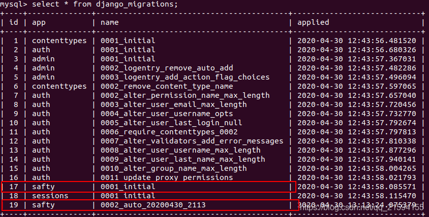 重新生成迁移文件,以应用名“safty”举例,因为已经有模型和数据库表,此时要制定应用名,否则会提示“No changes detected”