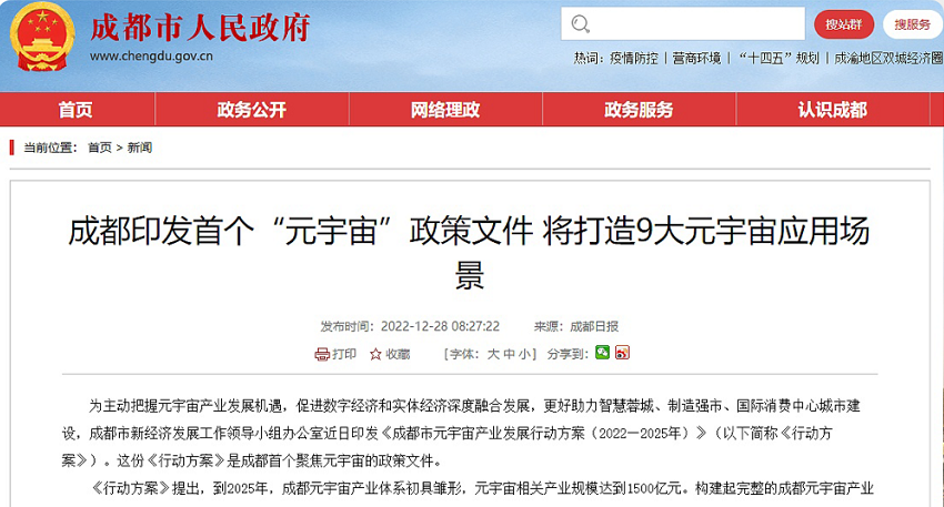 成都印发首个“元宇宙”政策文件,将打造9大元宇宙应用场景。为主动把握元宇宙产业发展机遇,促进数字经济和实体经济深度融合发展,更好助力智慧蓉城、制造强市、国际消费中心城市建设,成都市新经济发展工作领导小组办公室近日印发《成都市元宇宙产业发展行动方案 (2022—2025年)》(以下简称 《行动方案》)。这份《行动方案》是成都首个聚焦元宇宙的政策文件。