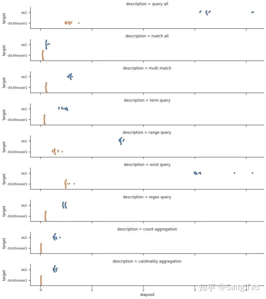 # ES { "aggs":{ "my-agg-name":{ "cardinality":{ "field": "priority" } } } } # Clickhouse "SELECT count(distinct(priority)) FROM syslog "我用 Python 的 SDK,对上述的查询在两个Stack上各跑10次,然后统计查询的性能结果。