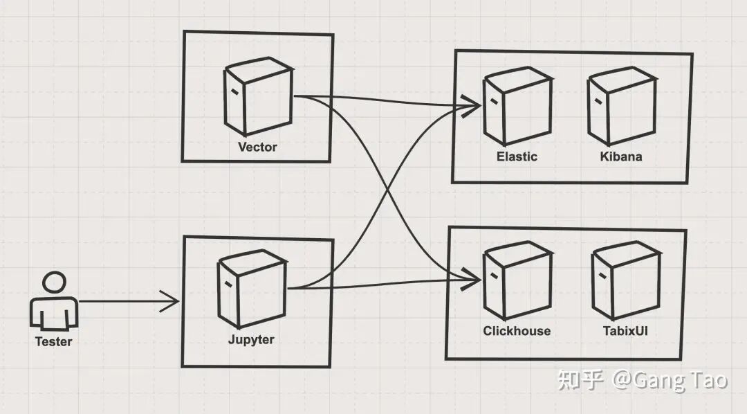 为了对比ES和Clickhouse的基本查询能力的差异,我写了一些代码(https://github.com/gangtao/esvsch)来验证。 这个测试的架构如下: